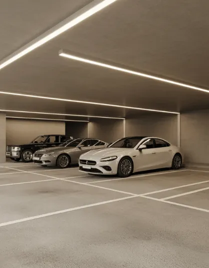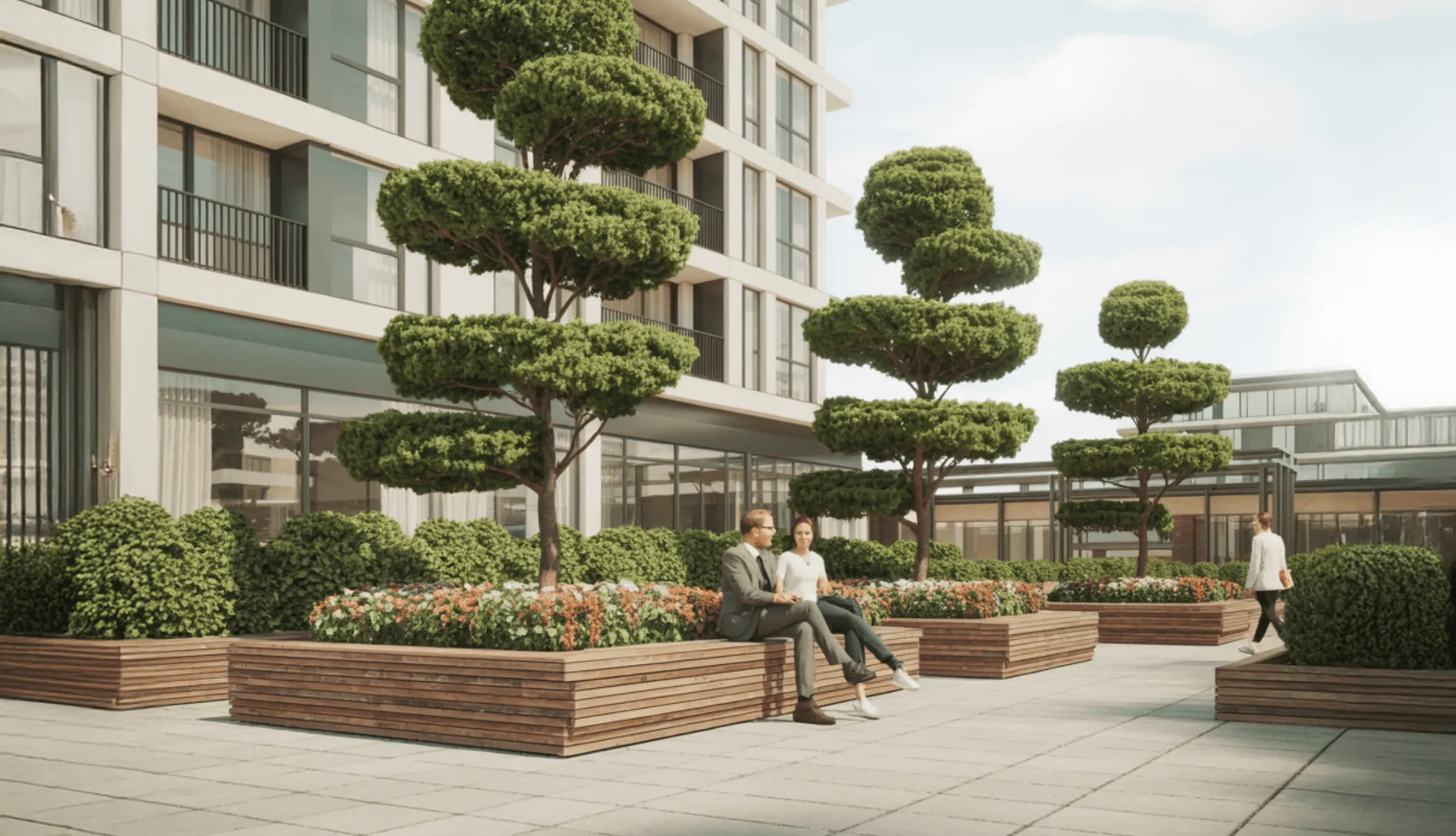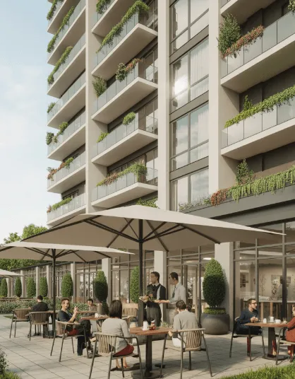 It offers a landscaped park on the roof of the commercial level, a green courtyard, a modern children’s area, and relaxation zones, creating a peaceful oasis within an urban environment.